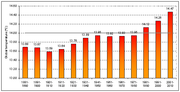 Temperatures: The average land and ocean-surface temperature for the decade 2001-2010 was estimated to be 14.47°C, or 0.47°C above the 1961–1990 global average and +0.21°C above the 1991–2000 global average (with a factor of uncertainty of ± 0.1°C).